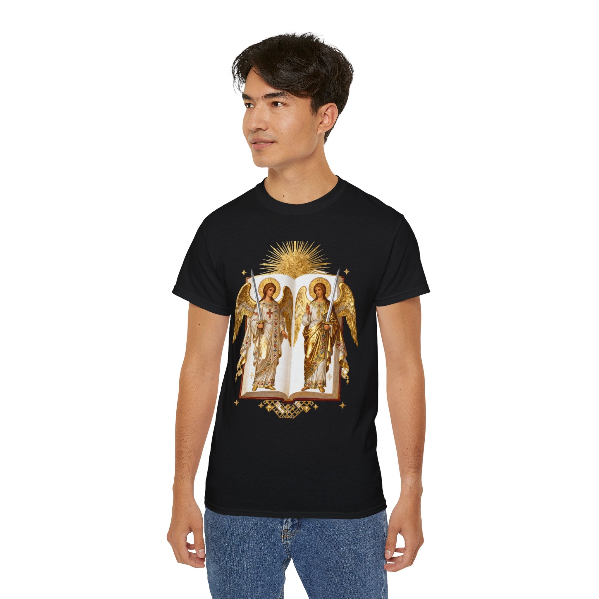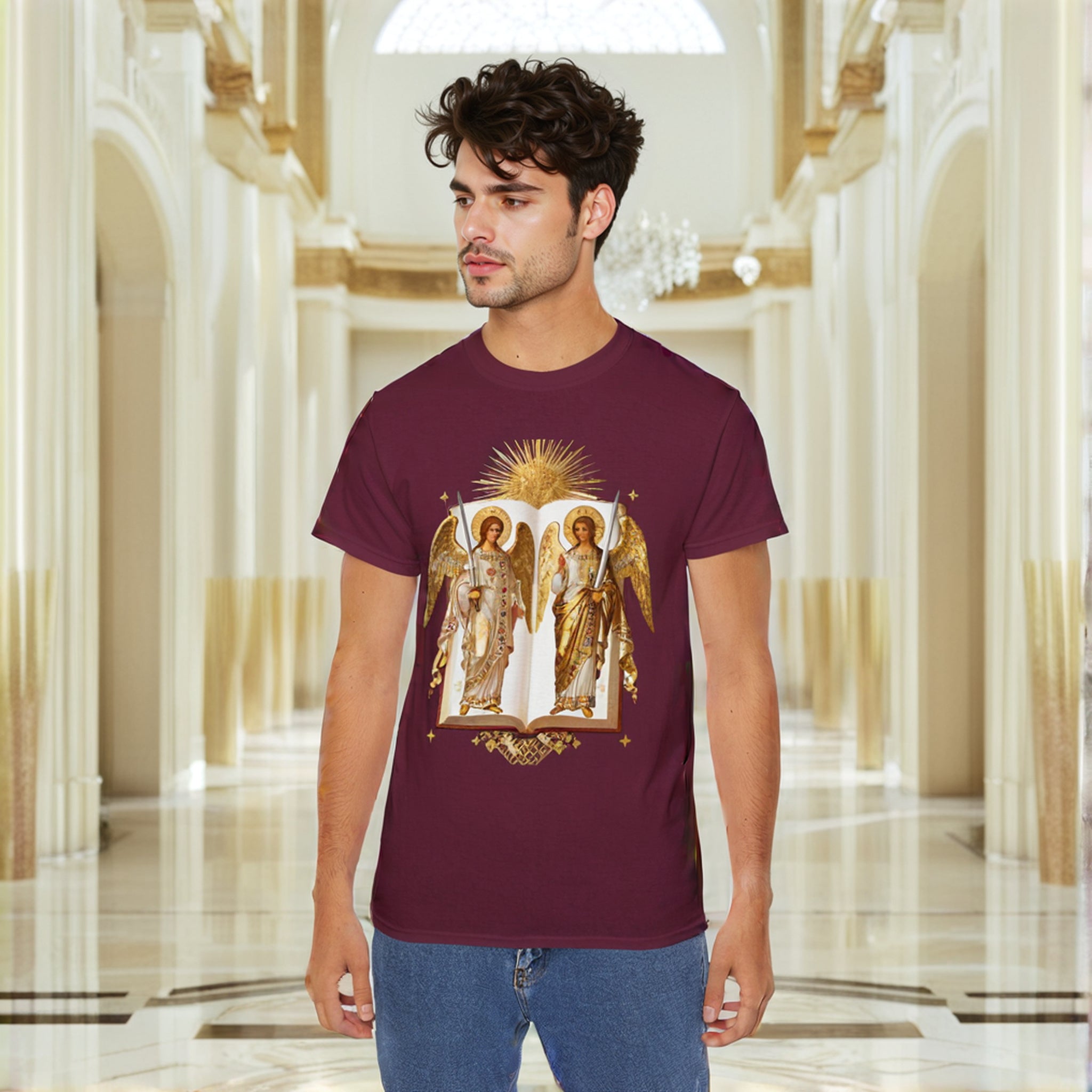 This bold tee captures the heavenly warrior Vitalis in a decisive clash within ancient cathedral walls — where stained glass glows and judgment falls. As the War-Monger Gargoyle hides behind sacred stone, Vitalis descends, sword blazing in celestial flame, striking fear into the darkness that once claimed sanctuary.